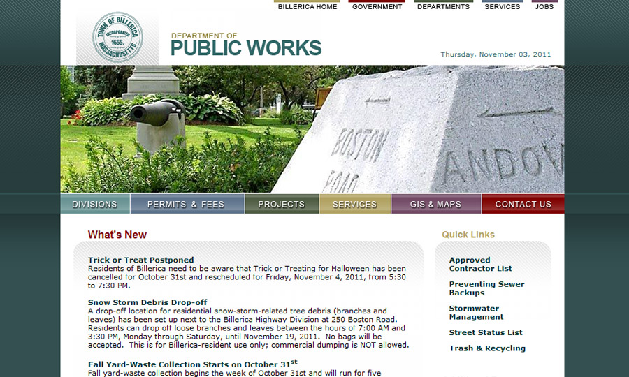 Website design & development for Billerica, Massachussetts Dept. of Public Works.